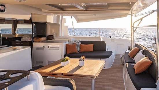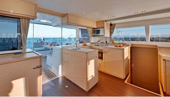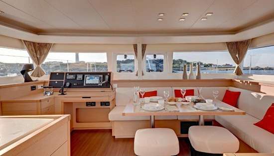 Інтер’єр добре продуманий з сучасною та елегантною обробкою, включає салон, повністю обладнаний камбуз (кухню) і зручні сидячі місця. Високоякісні матеріали, стильне оздоблення та продумані деталі сприяють створенню висококласної та привабливої атмосфери. Великі вікна і люки покращують природне освітлення і вентиляцію в каютах і зонах загального користування.